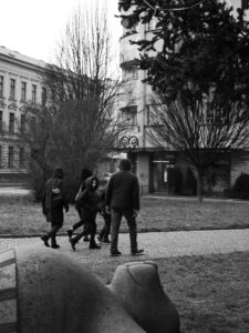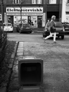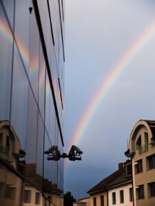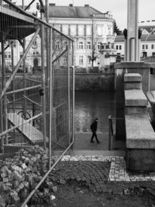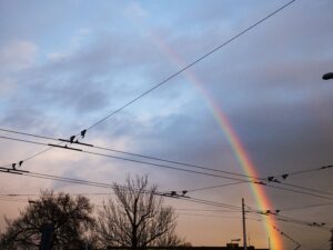 5. ledna jsem vyrazil na procházku s fotoaparátem, aniž bych měl nějaký konkrétní cíl, co se focení týče. Brzy se mi ale jasně zformovalo téměř hmatatelné téma. Bylo chladno, ale nemrzlo. Pršelo, ale ne příliš. Lidé chodili po ulicích, ale nevypadali nadšeně. Všude byla ještě vánoční výzdoba, ale už ne aktuální. Sváteční nadšení a očekávání spláchla realita toho, že se musejí lidé vrátit do práce, že jejich bankovní účet přes Vánoce utrpěl značné ztráty a že už nám ze zimy zbyla jenom ta zima. Řada novoročních předsevzetí nejspíš za těch pět dní už vzala za své. A zatímco jsem tak chodil a pozoroval, jakási prázdnota patrná v obklopující atmosféře, osud mému neplánovanému fotografickému sezení připravil drobné překvapení. Focení má pro mě v podstatě terapeutickou kvalitu, a i když jsem já sám v té chvíli příliš melancholie nepociťoval, přišlo mi příhodné, že se uprostřed té pochmurné nálady objevila duha, symbol naděje, byť ukotvený v realitě.